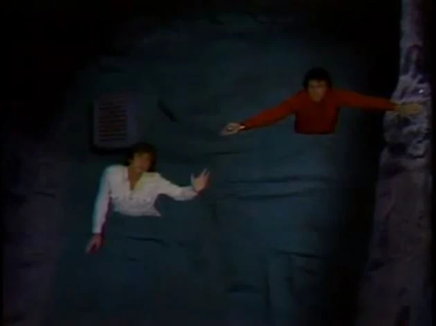 Rick then seats Holly on the foot of her bed as the apparition hovers nearby. Merging with Holly once more, the apparition then speaks of a "black Sleestak," and "we're going home" then warns, "Don't trust him!" Rick deduces that the apparition is speaking to someone else. When Rick asks where she is, the apparition says that she's in the mountain, and can see cars on the road in a valley below her. She also speaks of a green stone, then warns repeatedly "Don't touch them!" as she breaks the merging with Holly then fades from view.